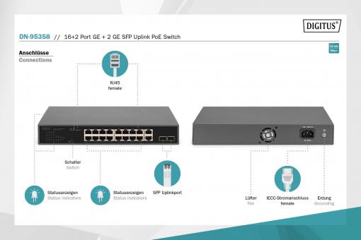 16+2 porty GE + 2GE SFP uplink PoE přepínač 16+2 porty 10/100/1000 Mb/s + 2GE SFP PoE switch