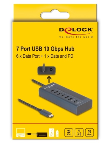 USB hub od Delocku může být připojen přes rozhraní USB Type-C™ k PC nebo notebooku. Má sedm konektory USB-C™. Lze připojit různá zařízení USB, jako například USB flash paměť, čtečku karet, externí pouzdro atd. Port USB-C™ PD 3.0 Tento port USB Type-C™ PD poskytuje výstupní výkon až 20 W. Displej LED vedle konektoru zobrazuje okamžitý napájecí výkon. Připojená zařízení jako smartphony mohou být napájena nebo data mohou být přenášena rychlostí 10 Gbps. Poznámka Alternativní režim DisplayPort (DP Alt Mode) není podporován, takže nejsou přenášeny žádné videosignály a nelze připojit žádné monitory. Technické detaily Konektor: 1 x USB 10 Gbps USB Type-C™ samec 6 x USB 10 Gbps USB Type-C™ samice 1 x USB 10 Gbps USB Type-C™ samice PD 3.0 (max. 9 V / 2,22 A) 1 x DC 12 V napájecí konektor Rychlost přenosu dat 10 Gbps Hostitelské zařízení nelze napájet přes port PD 6 x LED indikující 1 x indikátor napájení Robustní kovové pouzdro Barva: půlnoční modř Plug & Play Délka kabelu: cca. 60 cm Rozměry (DxŠxV): cca. 99 x 39 x 17 mm Specifikace napájecího zdroje Vstup: AC 100 ~ 240 V / 50 ~ 60 Hz / 0,8 A Výstup: 12,0 V / 3,0 A / 36,0 W Zem vně, plus uvnitř Rozměry: vnitřní: o cca. 2,5 mm venkovní: o cca. 5,5 mm délka: cca. 10 mm Systémové požadavky Android 11.0 nebo vyšší Chrome OS Linux Kernel 6.2 nebo vyšší Mac OS 13.1 nebo vyšší Windows 10/10-64/11 iPad Air (4-mé generace) nebo vyšší iPad Pro (3-mé generace) nebo vyšší Surface Pro 7 Zařízení s volným portem USB Type-C™ nebo volný port Thunderbolt™ 3 nebo Thunderbolt™ 4 Obsah balení Hub USB 10 Gbps Externí napájecí zdroj Uživatelská příručka Balení Kartonová krabice |